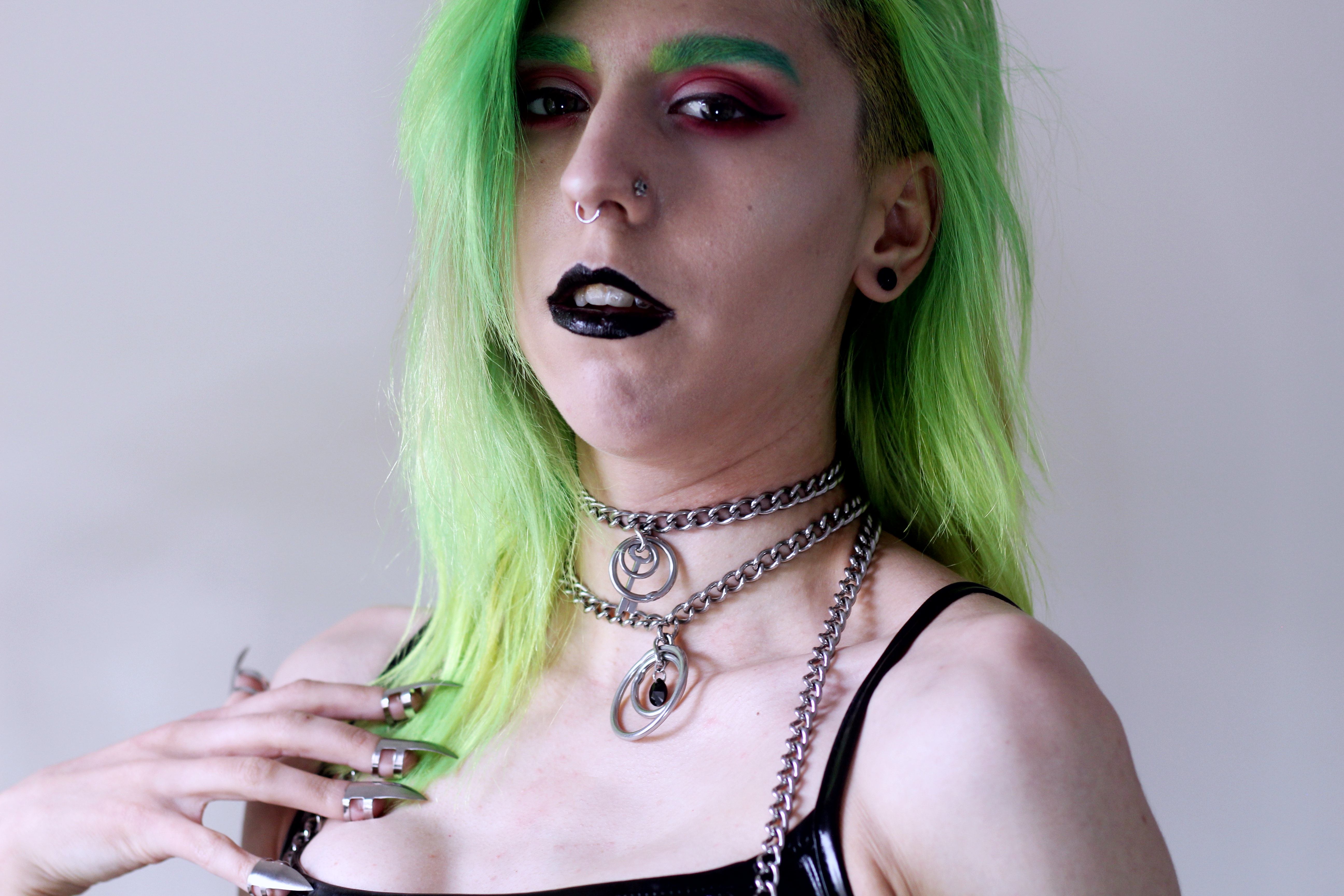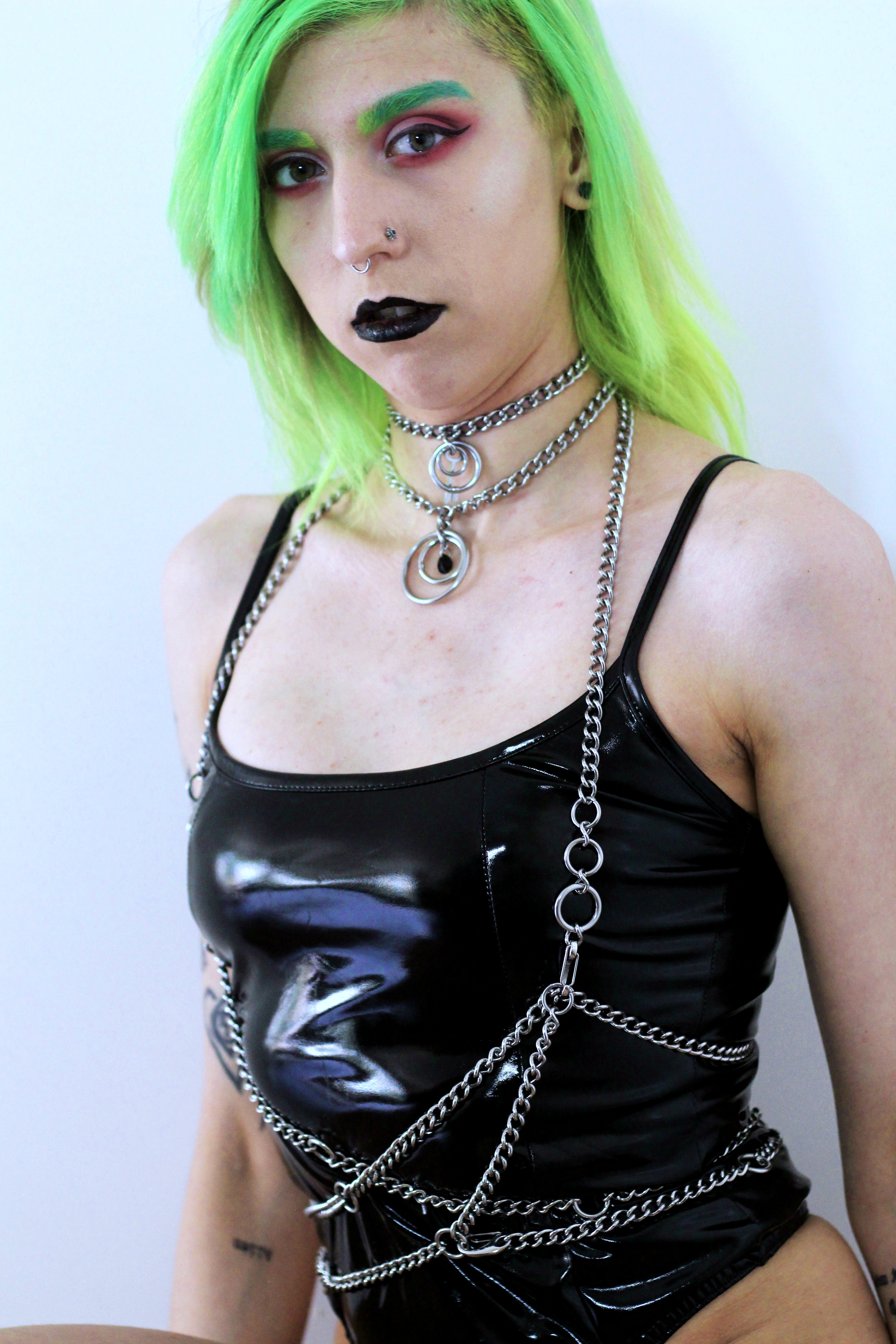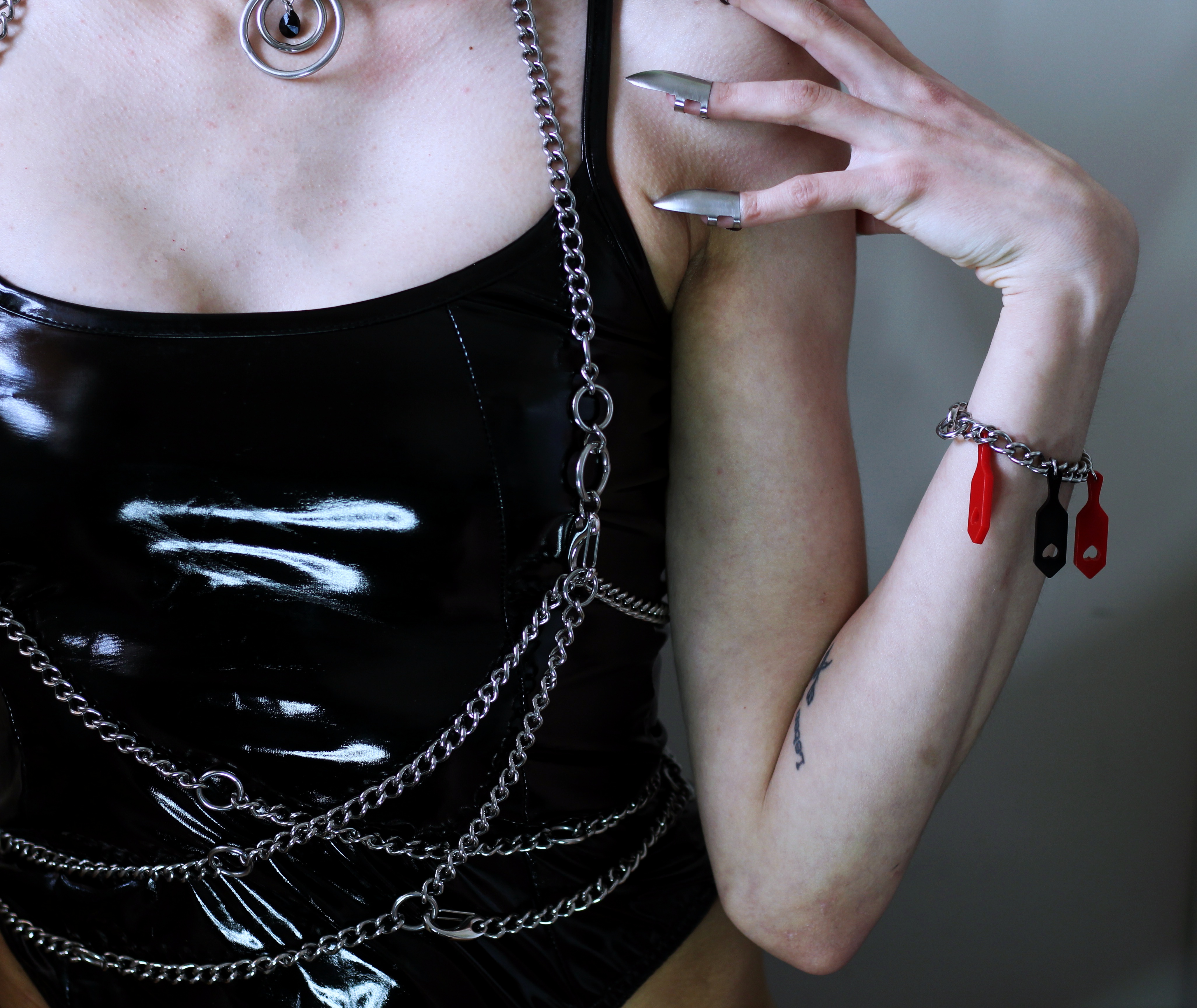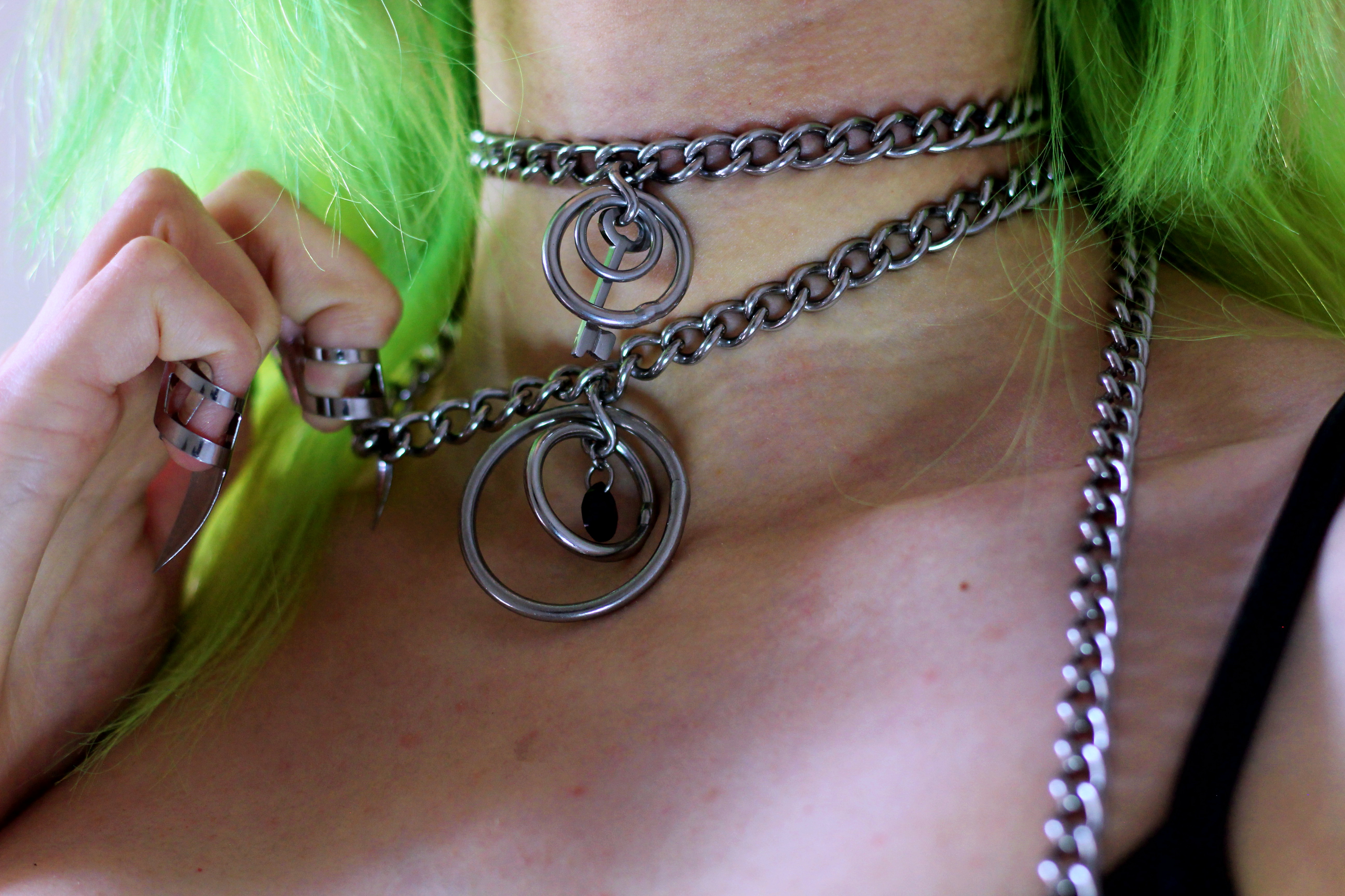 On harness side of things… Since Scarlet in Chains are a team of two individuals who put so much love into their pieces, they love making custom items. And excuse the language but I’m a slut for custom items, jewellery, shoes, clothes, you name it. I want it. For years my fashion sense has been little bit (ok fine a lot!) fetish-wear influenced, let’s just say harnesses are not something new to my wardrobe, I love to wear them, I love the look of them, vegan leather, with O-rings, buckles, you name it. I want it all. But I’ve never seen one made out of chain. Not one that wouldn’t break after two wear’s that is. Noticing that Scarlet in Chains do in fact sell chain harnesses, I contacted Sophie, asking if she could made me a custom, something that would be both restrictive, fun to wear and easy to style with. After providing her with a reference of what I was looking for she has made me the perfect chain harness that I think I’ve been looking for years! And wearing it with my collar and other necklaces made my them it almost looks like one piece item. It’s well made, simple and works perfectly with my style and wardrobe. I’ve been saying for years that a harness is a perfect accessory but a chain one, well it’s even better.