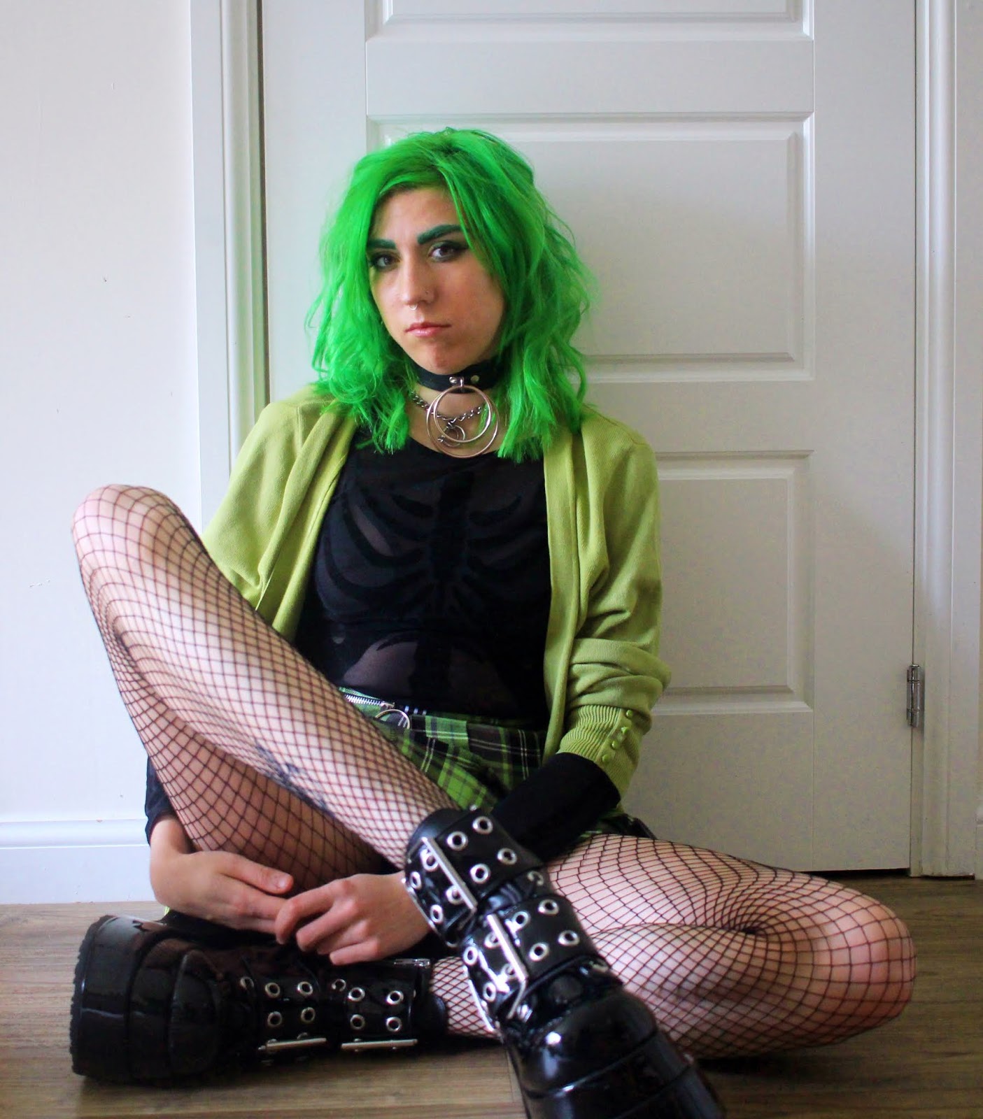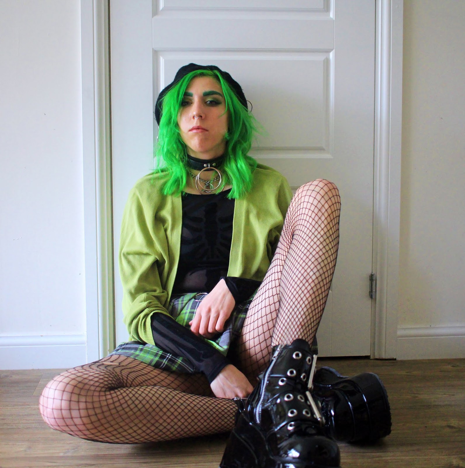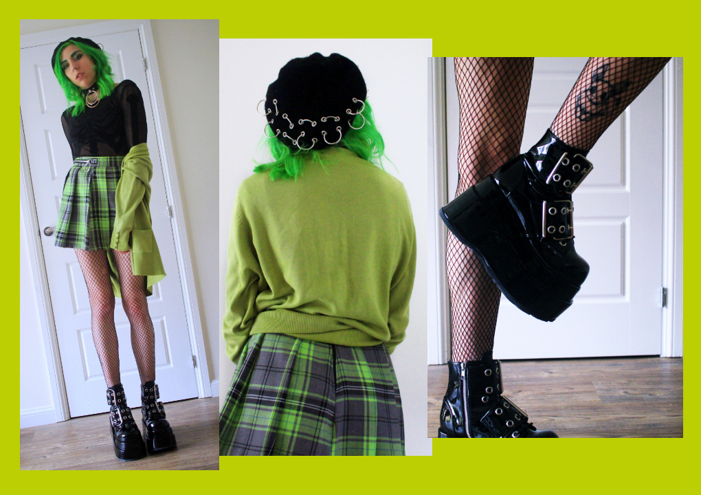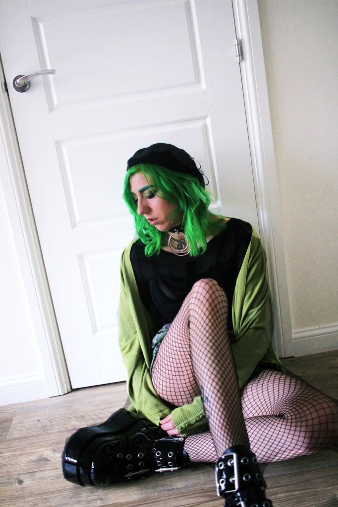 Bodysuit – H&M // Skirt – Love Too True // Cardigan – Thrifted // Tights – H&M // Beret – ASOS // Choker – Killstar // Shoes – Demonia