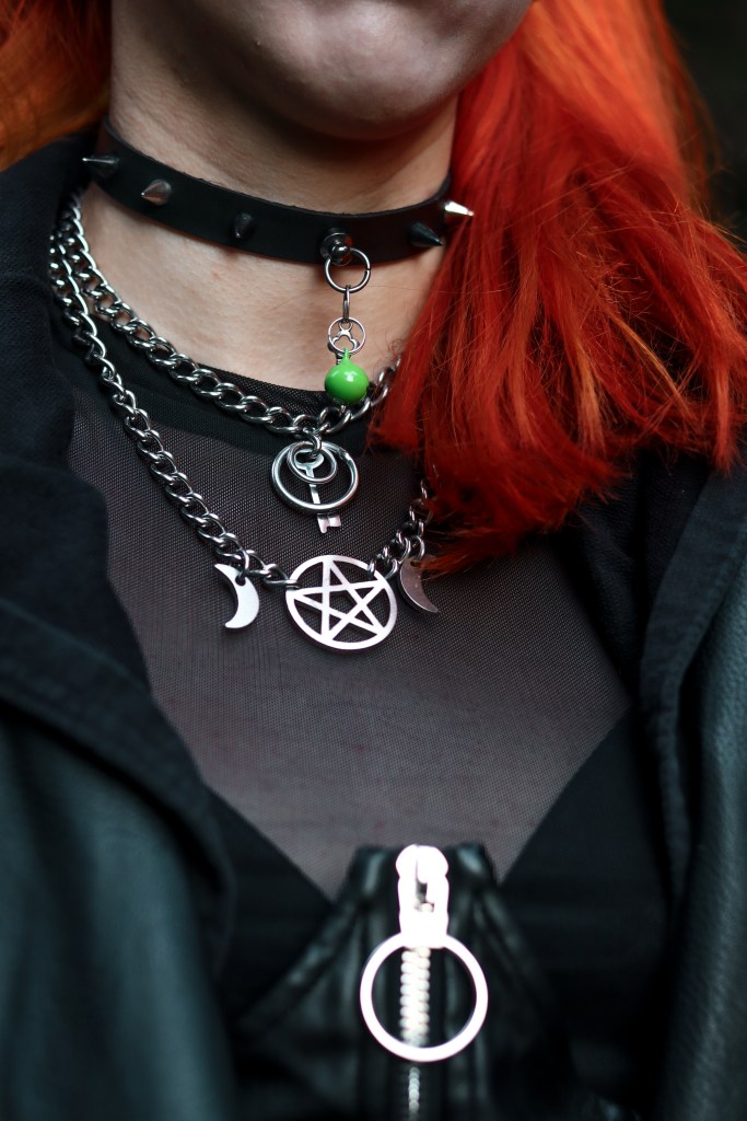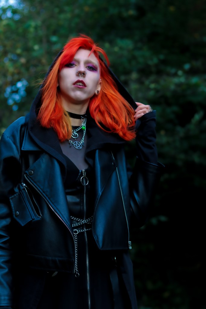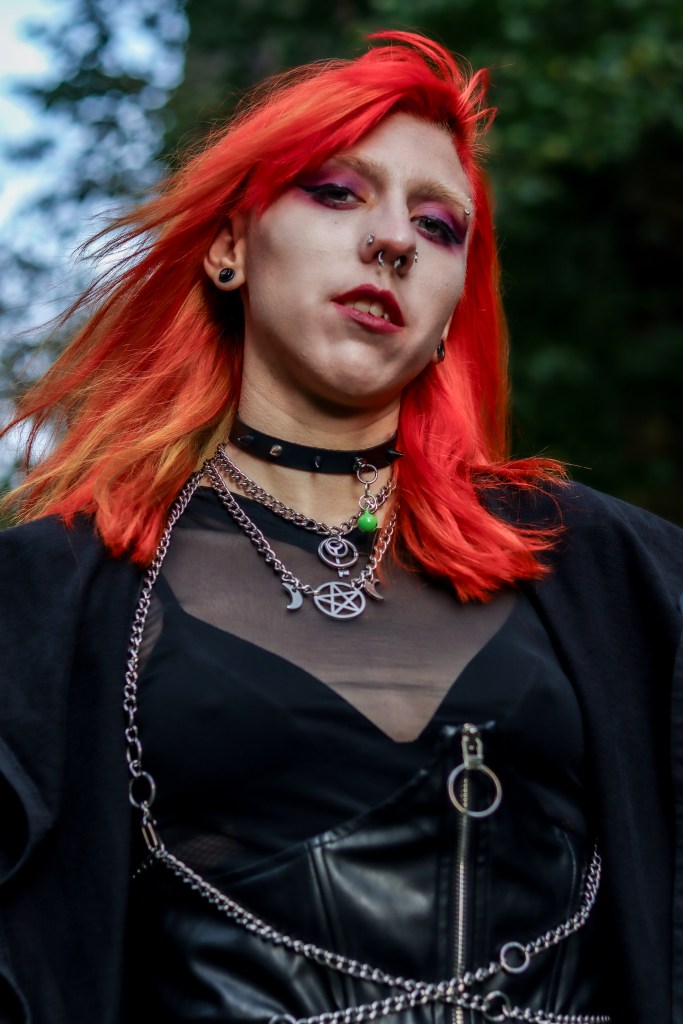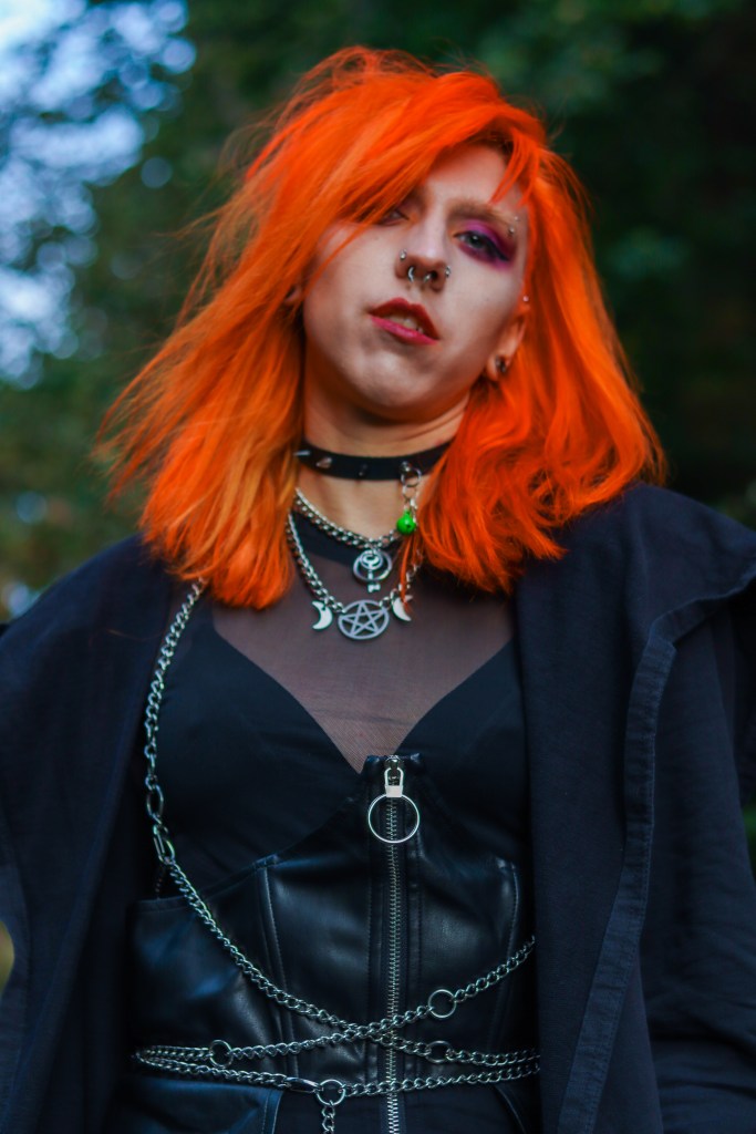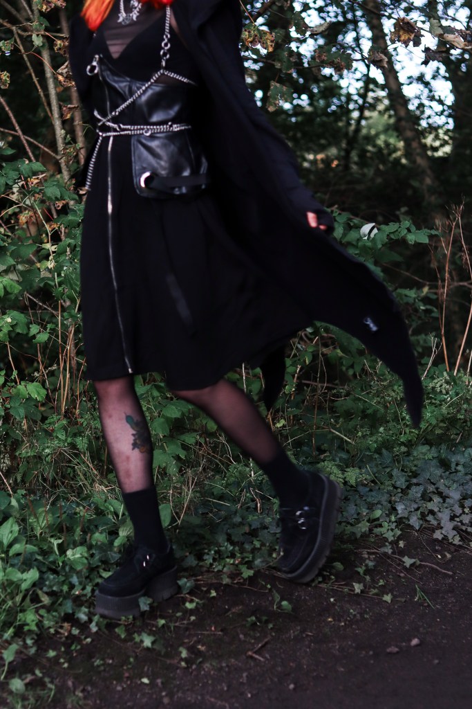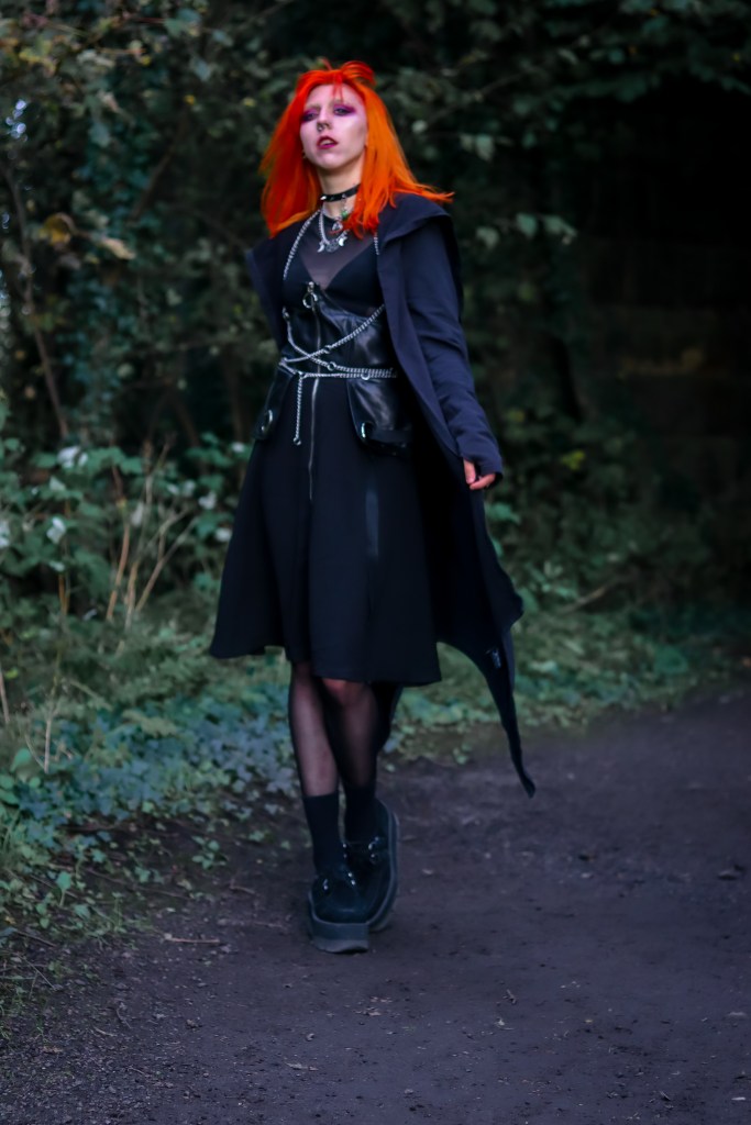 Cape – Killstar || Corset Skirt – Disturbia || Mesh Top – Bershka || Shoes– TUK || Harness + Necklaces – Scarlet in Chains || Choker – Depop (I think, it’s been a minute)